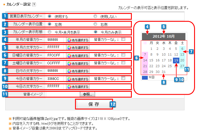 背景カラーのを設定しない場合は、背景カラーなしにチェックしてください。 - 10カレンダーの今日の文字カラーを指定できます。(色選択ボタンからカラーを選んでください)