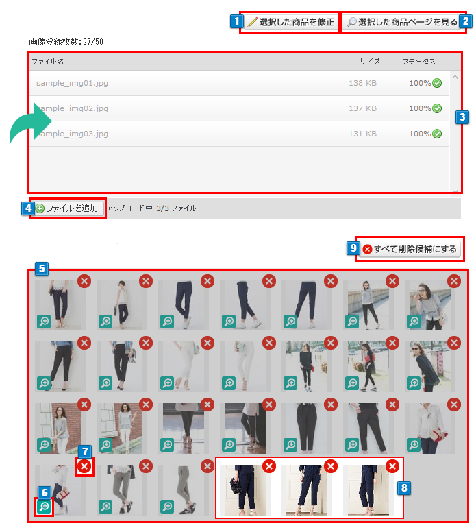 - 9画像を全て削除候補にします。削除候補にした後に「保存」ボタンをクリックすると画像が削除されます。