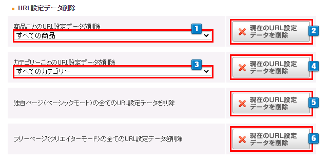 (対象カテゴリーに紐づく全商品に設定された任意URLを削除します) - 2クリックすると選択した対象のデータを削除します。