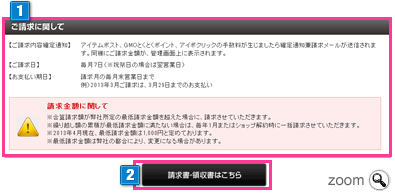 ただし、繰り越し額の累積が最低請求金額に満たない場合は、翌年1月に一括請求させていただきますので、あらかじめご了承ください。 - 2請求書・領収書を発行するボタンをクリックすると
