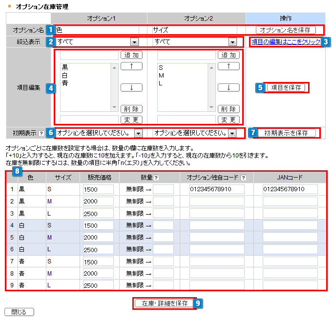 - 8「オプション1」、「オプション2」それぞれの組み合わせ、販売価格、数量(在庫)、オプション独自コード、JANコードを設定できます。