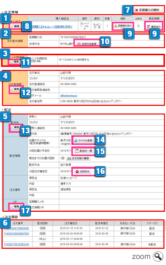 「次回休み」とした回は注文回数としてカウントされません。実際の注文生成数で回数をカウントします。 - 16「編集」をクリックすると注文情報の編集画面へ遷移します。