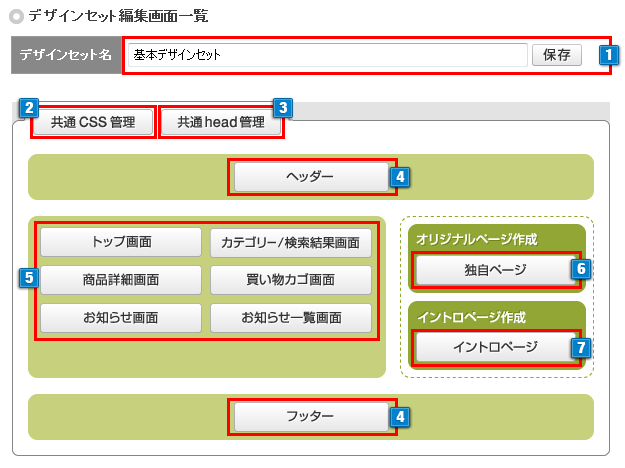 - 1デザインセットの名称を変更することができます。「保存」ボタンをクリックすると反映します。