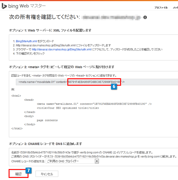 - 6<meta name="msvalidate.01" content="**********">の「**********」の部分をコピーします。