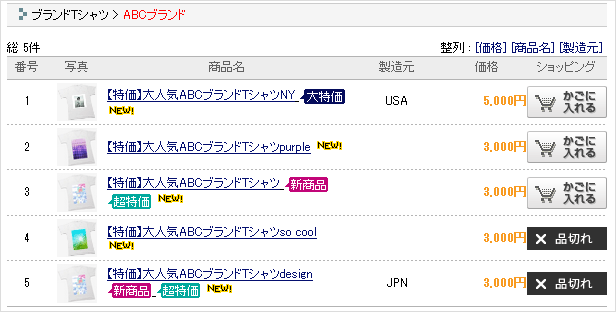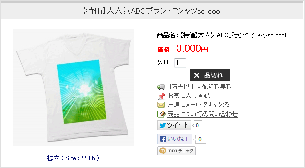 商品詳細ぺージ、カテゴリーページ(一部)に表示されます。⇒品切れ表示例